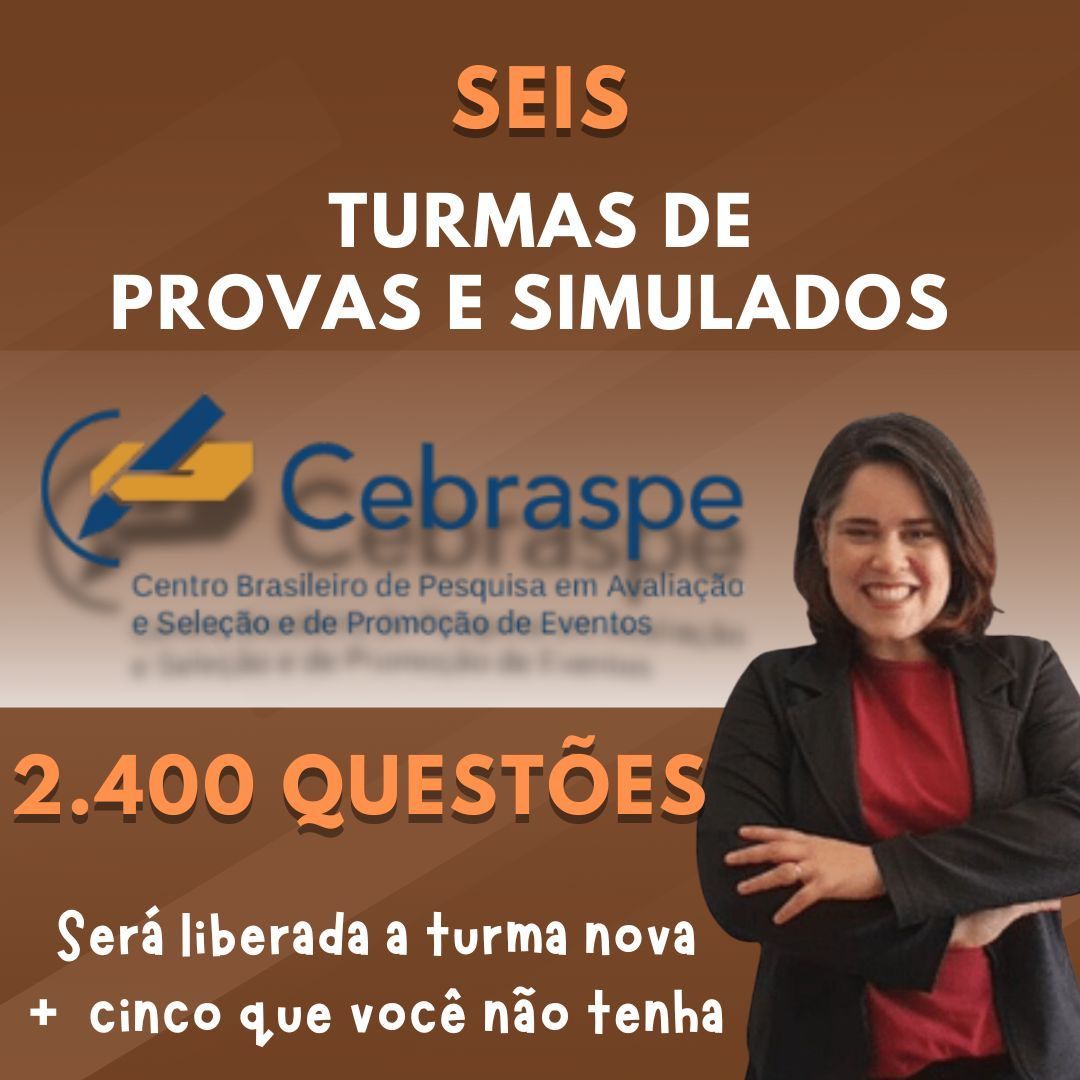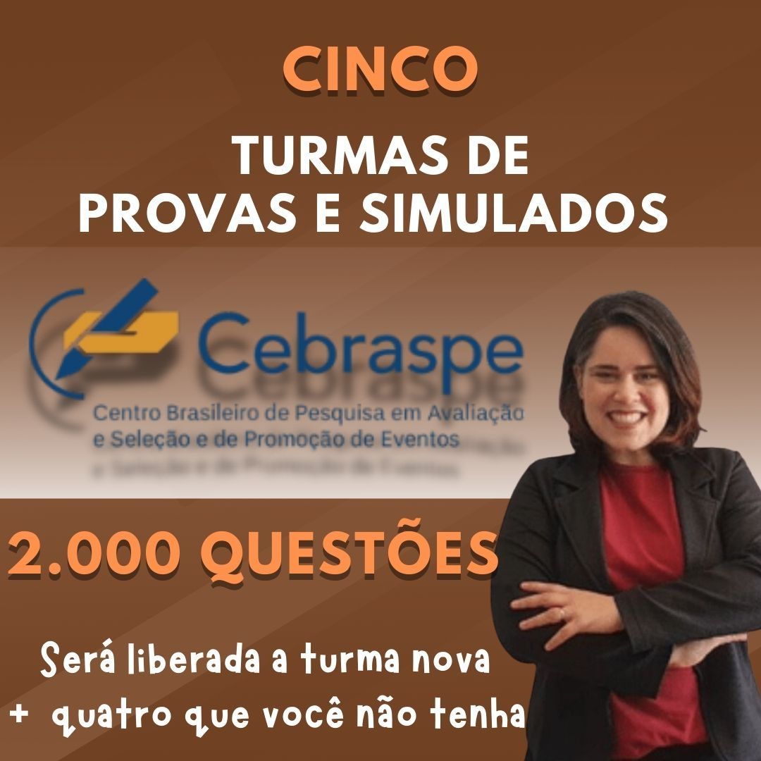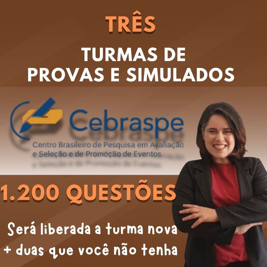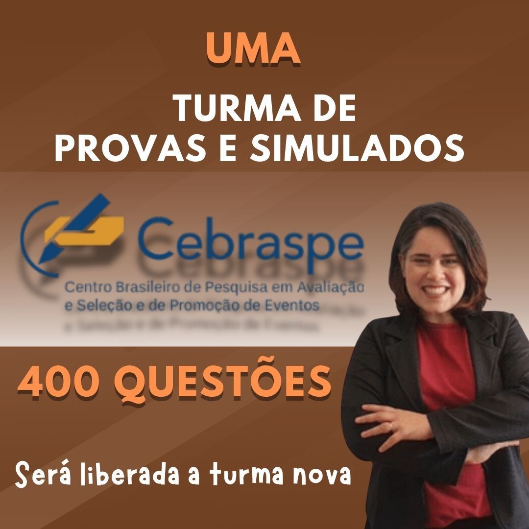 Prepare-se para transformar sua preparação para os concursos com as TURMAS DE PROVAS E SIMULADOS CEBRASPE, que é a maior banca para concursos públicos e cheia de particularidades em Língua Portuguesa! Esta é a sua chance de garantir um desempenho excepcional e se destacar nas provas. Com acesso a correções exclusivas e simulados realistas, você estará um passo à frente da concorrência. Afinal, na hora da prova, você vai fazer uma... Prova! E é claro que precisa treinar o que vai enfrentar. Não deixe essa oportunidade passar! Inscreva-se agora e comece a sua jornada rumo à aprovação!